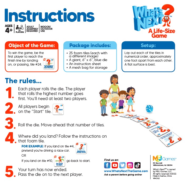 Introducing the life-size board game for family game night with a twist… You are the game piece! Jump, dance, joke, and laugh together, playing What’s Next? A Life-Size Game by M&J Games.