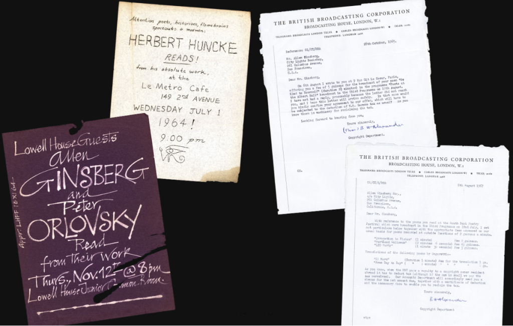 A poster for Patti Smith’s first-ever poetry reading. Correspondence from Allen’s stint as literary agent for William S. Burroughs and Herbert Huncke. Yippie manifestos from Jerry Rubin, Abbie Hoffman, and John Sinclair of the MC5. A ticket for a 1974 concert by Bob Dylan & The Band (with Yoko Ono’s phone number scribbled on the back). Posters documenting early Beat Generation readings in 1950s San Francisco as well as later ones capturing the 1960s Haight-Ashbury Hippie era.