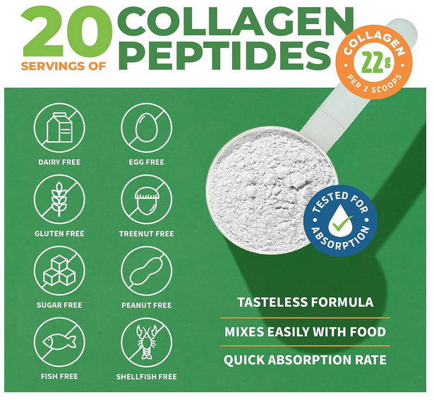 Collagen is the essential building block of joints, muscles and skin. Daily usage can thicken hair, spur nail growth, loosen joint stiffness, and make skin glow radiantly. Collagen Peptides are extra easy to consume – just mix them seamlessly into food or drink. No need to keep count of capsules and pills. Non-GMO. Free from gluten, dairy, eggs, and nuts. Third-party tested an independently verified for quality, potency, and absorption.