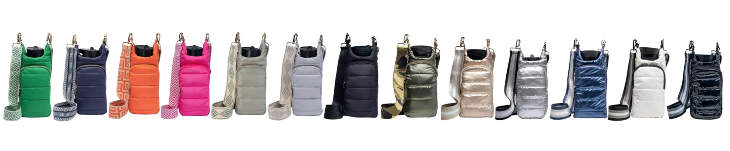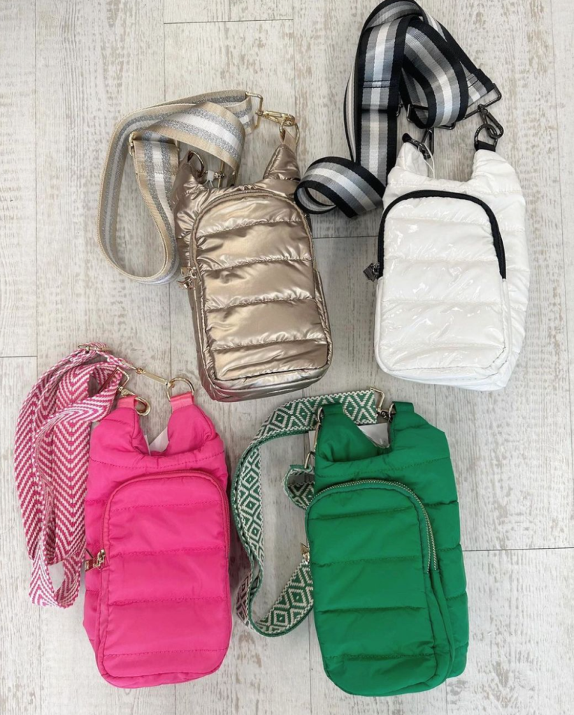 Let’s start with the WanderFull HydroBag, a stylish crossbody bag and water bottle carrier that combines fashion with functionality. Made from durable Puffer Coat fabric in black glossy with a black striped guitar strap (rose gold strap available in some images), the HydroBag is water-resistant and perfect for a variety of activities, from city strolls to outdoor festivals.