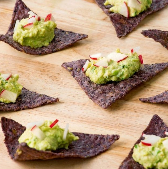 When the bread is as stale as dad jokes, tortilla chips make a great substitute. A quick and easy party-pleaser, this crostini-inspired appy features tasty dollops of avocado and edamame on Que Pasa volcanic stone ground blue corn tortilla chips. Cool and creamy with a load of subtle flavors, this fuss-free food keeps fingers clean, so you don’t have to worry about your upholstery.