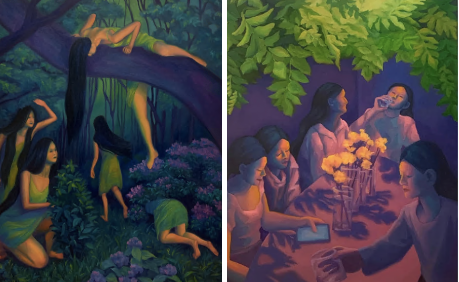 All of her paintings are of women, showing their mysterious sides in different environments and postures, while also highlighting their relationships with eachother. She primarily works with oil on canvas because it holds and stores and layers something important to her with each brush stroke. Her exhibit Spring Fever focuses on these women who are sparks of her own memories and experiences she has encountered mixed with the inner emotions and world that she has created.