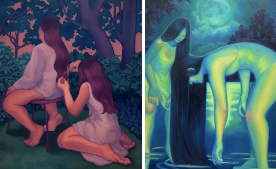 All of her paintings are of Asian women, showing their mysterious sides in different environments and postures, while also highlighting their relationships with other women. She primarily works with oil on canvas because it holds and stores and layers something important to her with each brush stroke. Her first exhibit Spring Fever focuses on these women who are sparks of her own memories and experiences she has encountered mixed with the inner emotions and world that she has created.