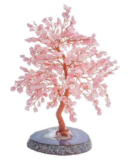 This tree sits upon an agate slice. The Love Harmony Feng Shui Agate Tree is made of hand wrapped copper wire with Rose Quartz leaves. This Tree of Life is also known as Feng Shui Tree and helps with balancing areas of your life and home. Rose Quartz is the stone of universal love. It restores trust and harmony in relationships, encouraging unconditional love. Rose Quartz purifies and opens the heart at all levels to promote love, self-love, friendship, deep inner healing and feelings of peace.