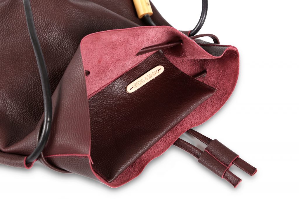 Bucket– Burgundy – Tumbled leather bucket bag featuring details in pinewood. This piece comes with a small interior pocket and solid hide strap. Also comes in Black, Ocean Blue, Forest Green.