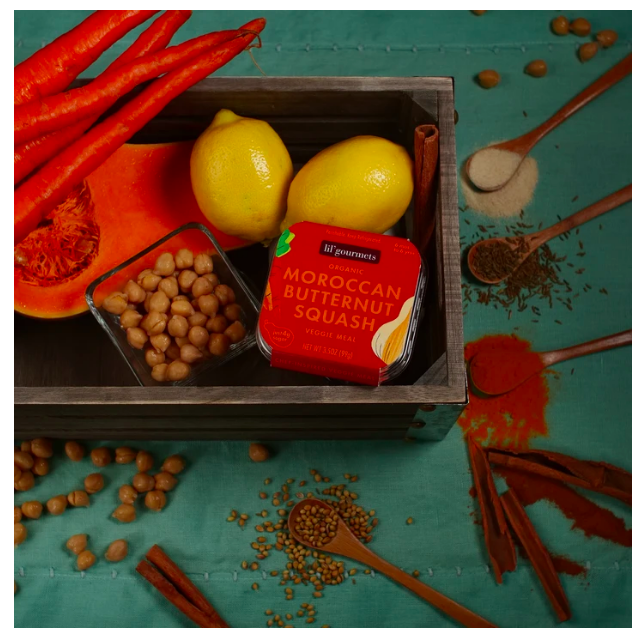 - Organic Moroccan Squash: Butternut squash, carrots, chick peas, a squeeze of tamarind & lemon, and a fragrant blend of 5 spices