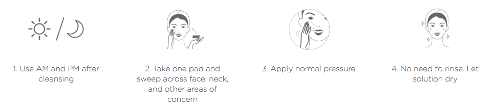 Exfoliating pads help remove dead skin cells, replenish moisture, and visibly minimize pore size. Skin looks vibrant, smooth, and refreshed. Skin never feels dehydrated.