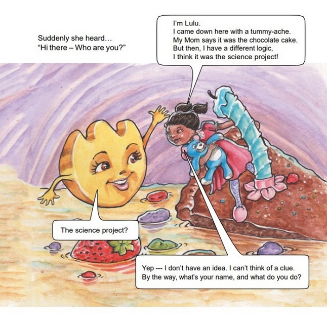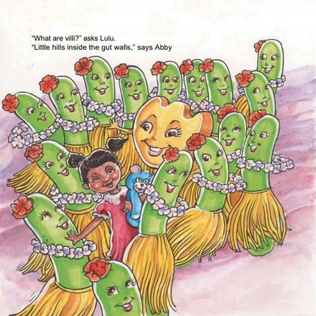 In Ewww! Lulu Meets the King of Poo, Lulu is feeling anxious about her upcoming school science report. She falls asleep and dreams that she swallows herself! Emily Enzyme takes Lulu on an “incredible digestible” tour, first through the small intestine, where Lulu meets Abby Acidophilus and dances the Acidophilus Hula. In the colon, Lulu meets Benny Bifidus, the King of Poo, who tells her, “Here we are – we all work together. If you take care of us – we’ll help you forever!” (song: “Do the Acidophilus Hula!” on http://janmaxcon.com/)