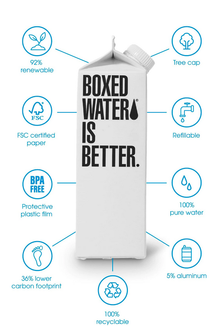 Plastic and aluminum are harming our planet at an alarming rate. In fact, 1500 plastic bottles end up in oceans & landfills every single minute and thousands of acres of forests are destroyed every year during aluminum production. Boxed Water Is Better for our planet. The paper-based cartons are FSC certified, 92% renewable, and 100% recyclable, making them the most sustainable carton in the water aisle!