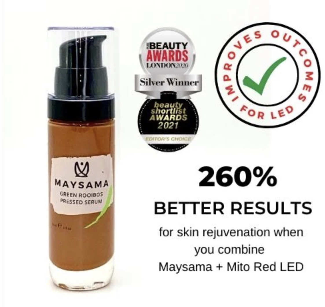 Maysama is an eco-conscious, science-backed skincare brand developed with pulse light therapy and green rooibos (unfermented leaves) to achieve the exact results you are looking for! Higher in antioxidants than its red counterpart and 70 times more potent with red light help, rooibos is at the heart of all skincare products offered. Optimizing skincare, Maysama Beauty combines the antioxidant power of Aspalathin-enriched green rooibos skincare with LED light therapy for improved outcomes for skin rejuvenation. Follow them on Instagram @maysama_beauty.