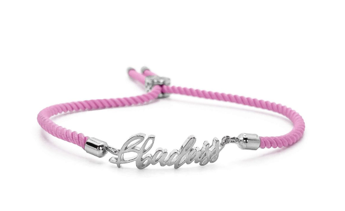 The bracelet design links cursive phrases with either a colorful bolo cord or a delicate chain held by a lobster claw clasp accented with a black gemstone known for positive energy.