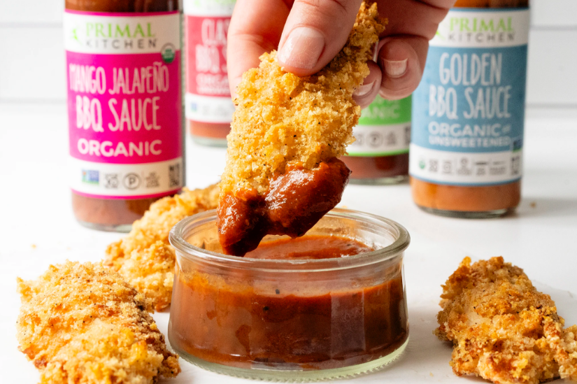 Most kids, no matter how old, adore chicken tenders. OK, maybe some (or most?) adults love them, too. These eat-with-your-hands family favorites are breaded with a spiced coating then usually deep fried until they reach golden perfection. Moist on the inside, crunchy on the outside, chicken tenders are fun to dunk in BBQ sauce, ranch dressing, ketchup, honey mustard, sweet and sour sauce, and on and on. Instead of buying frozen pre-made chicken tenders, or ordering them out at a sports bar, here created a Primal/paleo chicken tender recipe that includes no eggs, dairy, gluten, or grains. This paleo chicken tenders have an extra special zip, as using Primal Kitchen Vegan Ranch Dressing in the wet batter to ensure that this seasoned grain-free coating sticks to the chicken pieces. Dip the chicken tenders in Primal Kitchen Classic BBQ Sauce for tangy, smoky BBQ-ranch flavor.