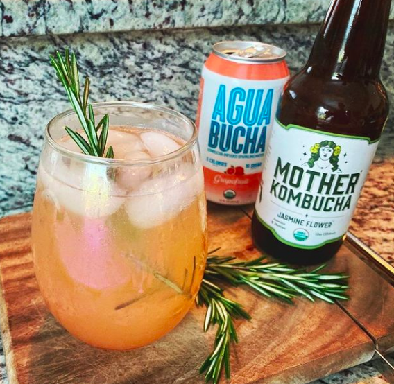 1 can of Grapefruit Agua BuchaCombine the kombucha, grapefruit juice and maple syrup in a pitcher or measuring cup. Fill two of your favorite glasses with ice and pour the concoction over top. Top off each glass with a generous splash of Agua Bucha. Gently rub the rosemary between your hands to release the oils on the leaves.
