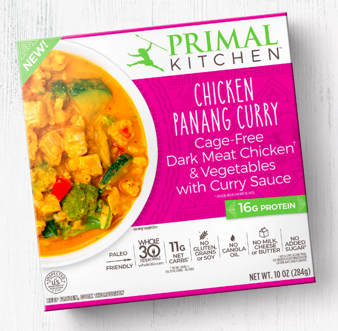 Keep calm and curry on. Paleo Friendly, Whole30 Approved® and made without dairy, gluten, or grains, the Chicken Panang Curry Bowl from PRIMAL KITCHEN™ bowls over all other microwaveable foods. This cage-free dark meat chicken* curry is a game changer: with 16g of protein, this bowl is sure to be the envy of every breakroom.