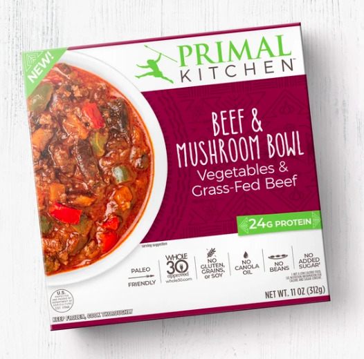 Beef & Mushroom BowlInspired by a beloved recipe from founder Mark Sisson’s daughter Devyn, this Paleo-Friendly, Whole30-Approved® Beef and Mushroom Bowl from PRIMAL KITCHEN™ uses grass-fed, pasture-raised† beef with no added hormones and antibiotics. Made without beans, dairy, gluten, or grains, and 24g of protein, this bowl will make you forget everything you thought you knew about frozen! And get ready to be bowled over with innovative packaging: Primal Kitchen’s bowls are made from recycled sugar cane fiber for a bowl without PFAs. Don’t make a mess in the kitchen… make mealtime into “me time” with a simple to prepare bowl with tender beef, flavorful mushrooms, and high-quality ingredients like organic onions, peppers, and garlic. Aromatic, comforting, and made without canola oil or added sugar*, this frozen bowl can be microwaved in minutes or cooked in an oven.