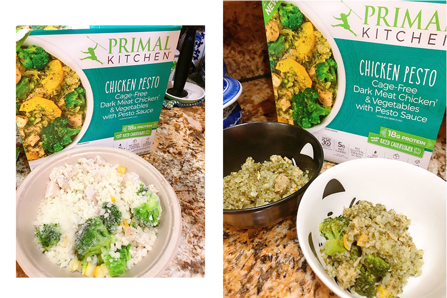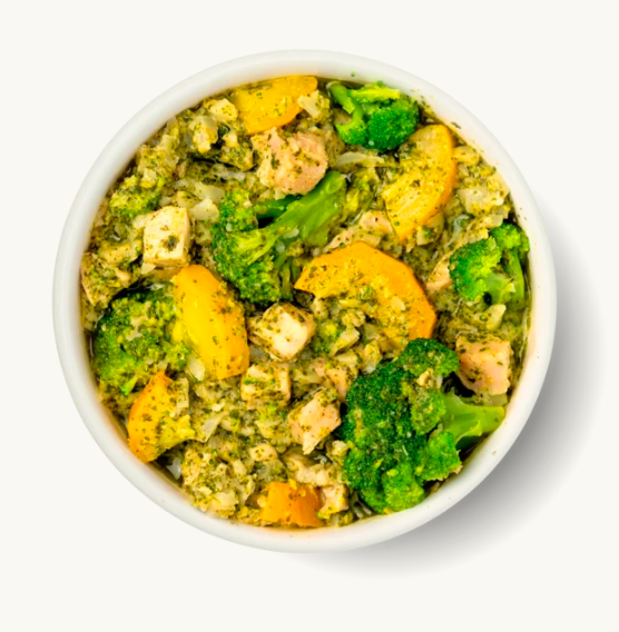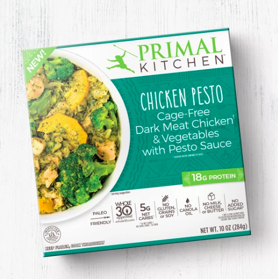 Chicken Pesto BowlEven if you’ve just got a few minutes, real food is on the menu with this savory PRIMAL KITCHEN™ Chicken Pesto Bowl with satisfying flavor featuring cage-free, dark meat chicken* and a delicious, nutty, pesto blend. This Chicken Pesto is Paleo Friendly, Whole30 Approved®, made without gluten or grains, and pairs perfectly with nights in (sweatpants not provided). A take on our co-founder, Morgan Zanotti’s very own pesto, this bowl is made without milk, cheese, or butter, and with no added sugar†. With delicious, high-quality ingredients like riced cauliflower, yellow zucchini, broccoli, and a creamy pesto blend, with 18g of protein in every serving, this comforting bowl can be made in the oven or microwave. And finally, flavor satisfaction in a ready-to-heat-and-eat bowl in sustainable packaging! PRIMAL KITCHEN™ uses an innovative, upcycled bowl made from recycled sugar cane fiber.