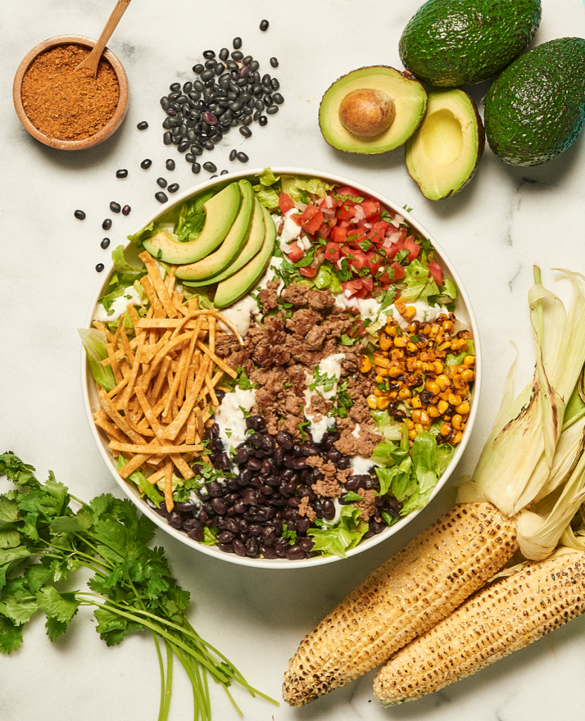 - Impossible™ Taco Salad: Impossible seasoned ground meat made from plants, romaine lettuce, black beans, roasted corn, salsa fresca, tortilla strips, sliced Haas avocado and signature pickled jalapeno ranch dressing.