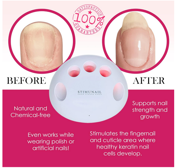 Encourages weak, damaged, & brittle nails to grow strong fast! Stimunail targets the cuticle and nail matrix where keratin-rich nail cells develop and grow. StimuNail tri-function technology combines three chemical-free fingernail nourishing therapies into one easy, safe device you can use at home in just 3 minutes a day for healthy, visible results in as little as 12 weeks.