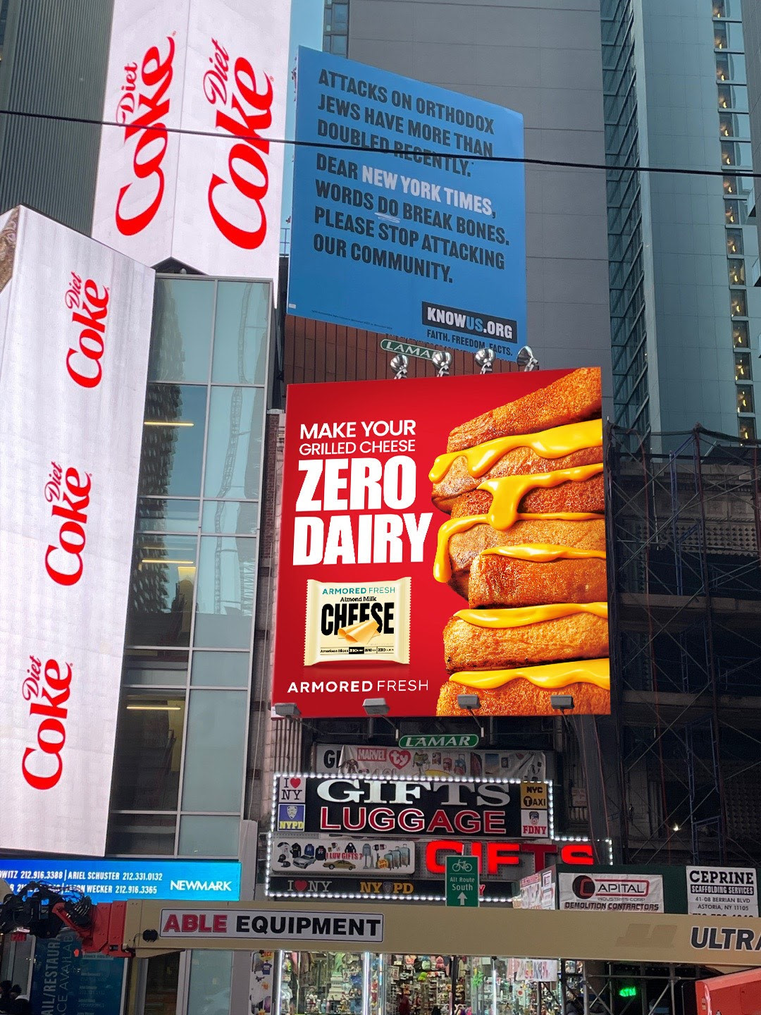 Cutting-edge global food tech company, Armored Fresh, announces the consumer launch of ‘Almond Milk American Slices,’ their latest innovation in zero-dairy, plant-based cheese. ‘Almond Milk American Slices’ marks the company’s second product launch, which is available through retail distribution in more than 100 NYC regional supermarkets including Key Foods, Met Fresh, C Town, City Acres, & Associated stores throughout Manhattan and Brooklyn. To announce the launch, Armored Fresh has unveiled its latest billboard on 49th Street and Broadway.