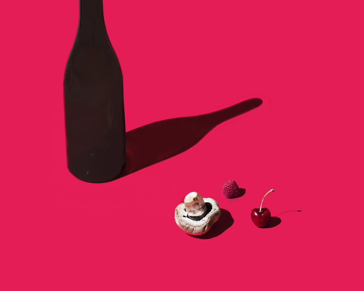 Part of a larger series, this image is a visual snapshot of how to remember solid snippets of wine grape facts. The shadow tells us Pinot Noir typically comes in a “Burgundy” shaped bottle. The cherry, bramble fruit and mushroom are meant to imprint three of the main characteristics often attributed to Pinot Noir. The red backdrop reminds us of the classic warm tones this noble red grape takes in the glass.