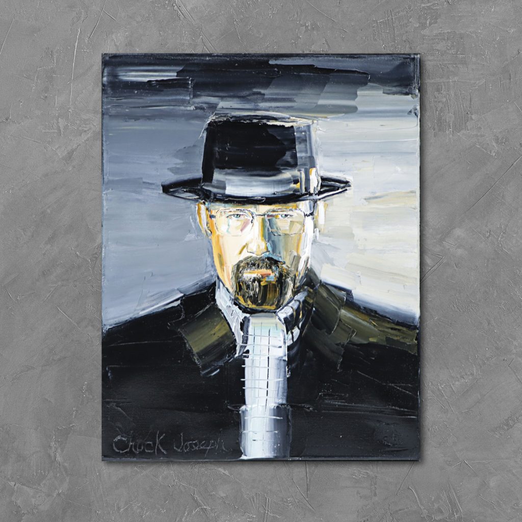 - The One Who Knocks, 11×14 inches; Oil Palette Knife on Canvas, $1,850 – A painting of the award-winning television series protagonist Walter White depicting the moment the mild-mannered chemistry teacher becomes the meth-peddling drug lord Heisenberg, as portrayed by Bryan Cranston in the AMC crime drama “Breaking Bad.”