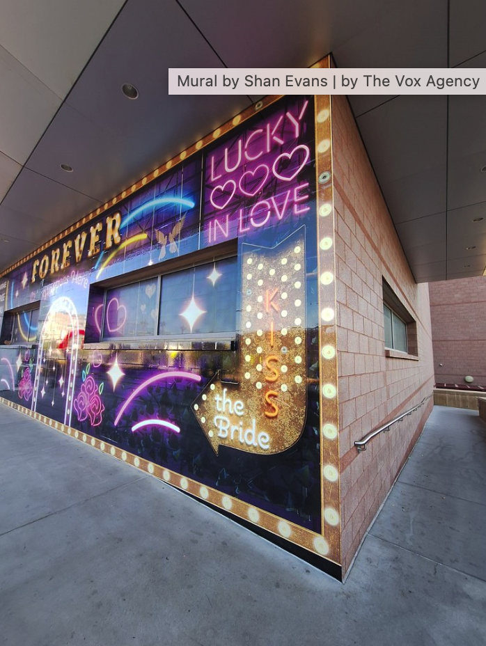 Evans was selected as the winner of a competitive local artist contest earlier this year, that attracted entries from some of Las Vegas’ most talented creatives. With a reputation for his compelling street art and larger-than-life murals, Evans is celebrated for his ability to convey emotion through bold colors and striking compositions. His new piece for the Wedding Capital of the World™ encapsulates the glamor and allure of Las Vegas, merging the city’s storied past with its ever-evolving role as the ultimate destination for love and marriage.