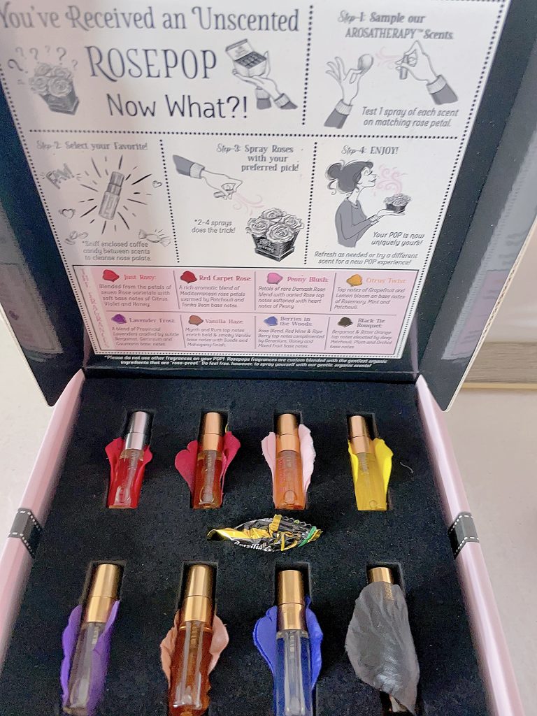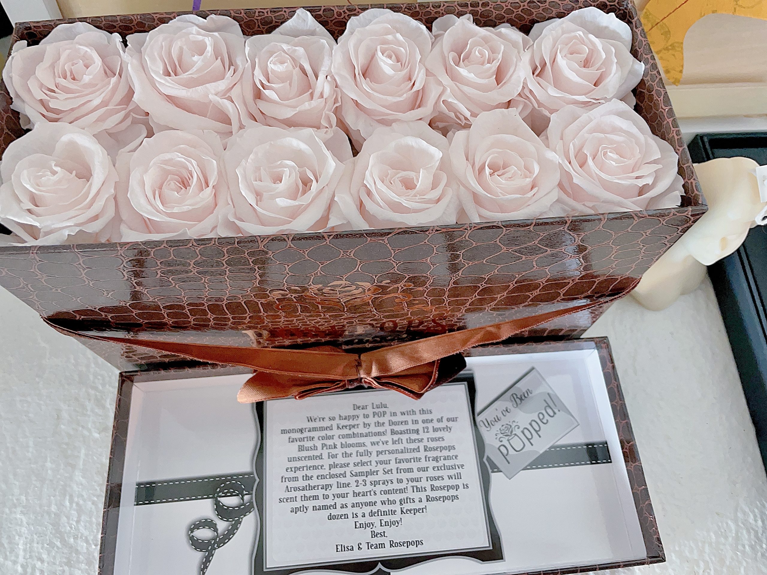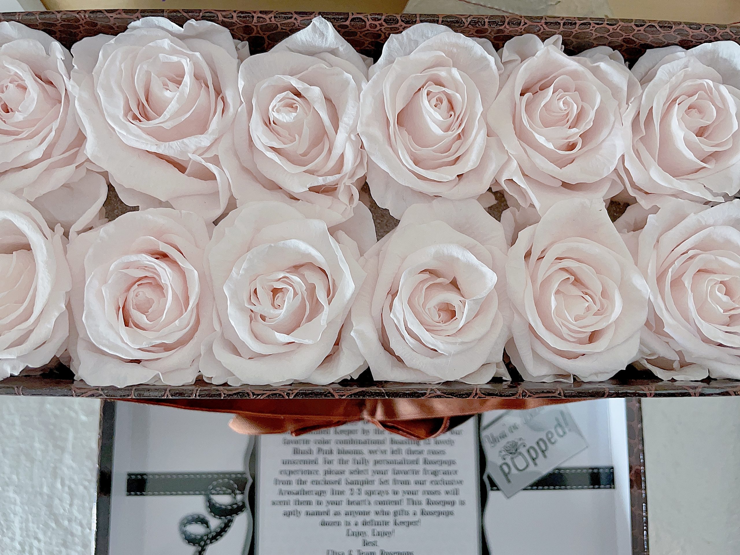 Twelve captivating Cotton Candy blooms make the perfect dozen, housed in Rosepops rich Chocolate Brown mock crocodile box. For the ultimate in personalized gifting, these preserved petals have been left unscented, and are accompanied with our luxurious Arosatherapy Sampler Set. Your loved one will be able to select their favorite of Poproses custom blended fragrances and with 2-3 sprays to the roses, customize their POP to their sense’s delight!