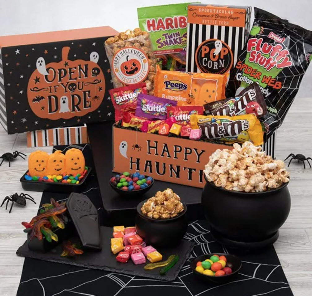 It may not come with witches chanting Shakespeare’s famous couplet, “‘Double double, toil and trouble – fire burn and cauldron bubble,” but GourmetGiftBaskets.com’s “Haunted Halloween Care Package – Open If You Dare” is just as classic.Filled with everyone’s favorite candy and popcorn treats, your gift will spellbind whoever gets it. This cauldron, oops!… we mean care package, includes caramel popcorn, gummy snakes, M&Ms, Skittles, spider web cotton candy, and more!