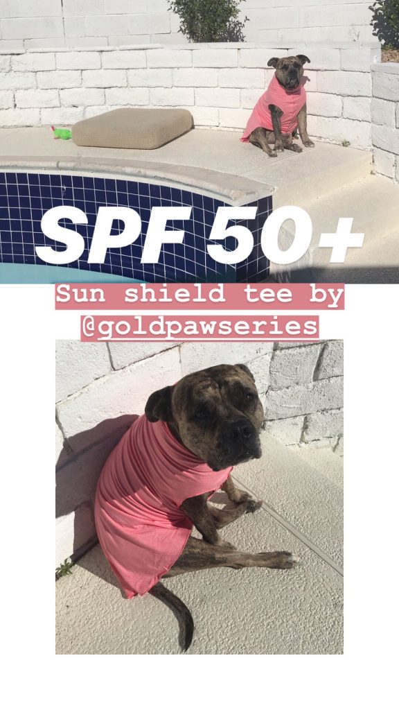Before Swim season and during Spring, Cami’s favorite thing to do is to sit by the pool. She gets overheated and has to come inside. Letting her wear this Sun Shield Tee by Goldpaw Series has given her more outside time this morning! She has been so bummed since her knee surgery 🙁 I thought this will surely cheer her up! Thank you to our friends from Goldpaw Series for sending Cami this in size 28 Coral.Sun Shield Tee Fabric – An ultra smooth, lightweight, breathable athletic jersey that features a UPF 50+ rating and blocks 98% of harmful UV rays. This is achieved through a tight mechanical weave, so sensitive skin won’t react to a chemical wash. It significantly reduces heat absorption by reflecting heat away from the body, and is efficient at wicking away moisture. A soothing and cool to the touch feel. Found in: The Sun Shield Tee