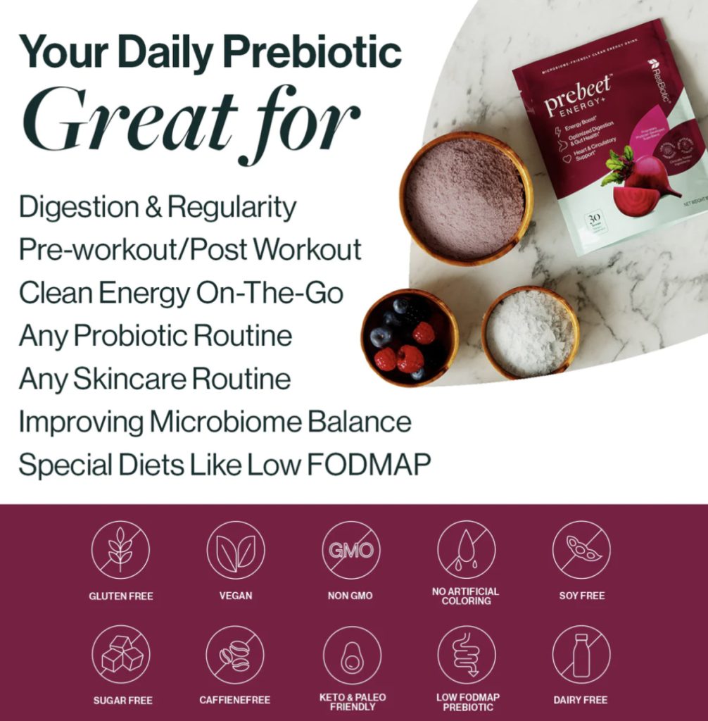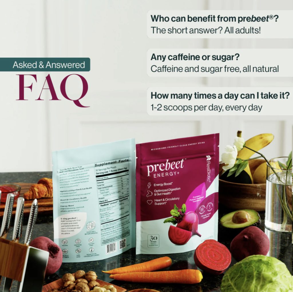 prebeet® clinically studied prebiotic resistant potato starch has been proven to increase the production of Bifidobacterium, an important probiotic for digestive wellness, and significantly increase Akkermansia muciniphila, an important bacteria for improving gut/barrier function and permeability of the gut lining, or Leaky Gut. Whole beets are a prebeet® hero ingredient with their rich source of nitrates and fiber that support improved circulation and positive heart health. Last but certainly not least, the high dose of vitamin B12 in prebeet® works hard to support brain cell function by converting food into healthy cellular energy. Since most people are deficient in B12, consuming high doses can have therapeutic benefits for your body.