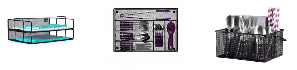 - Compact Organizer Caddy – features 8 compartments and one pull-out drawer. Like all Mindspace products, this compact, but roomy organizer is constructed of sturdy, mesh metal that’s as tough as it is good looking.