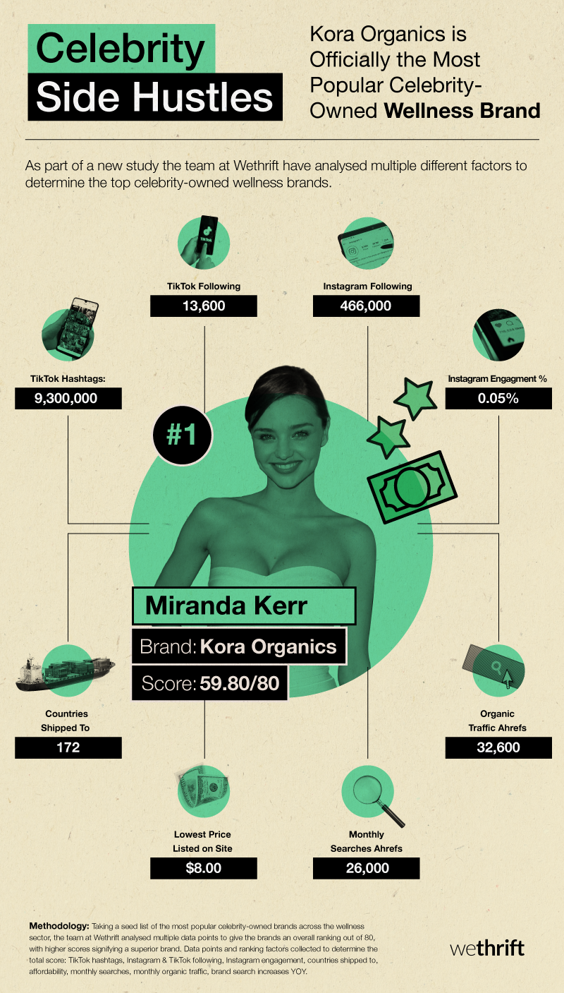 articles/celebrity-side- hustles/ Methodology: Taking a seed list of the most popular celebrity and influencer-owned brands across the wellness sector, the team at Wethrift analysed multiple data points to give the brands an overall ranking out of 80.