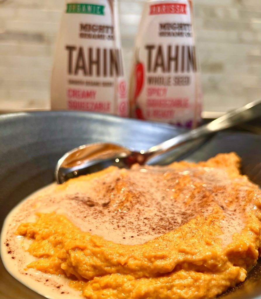 - Combine cooked garlic, sweet potatoes, cinnamon, and Mighty Sesame Tahini. Mix and season with salt and pepper to taste.