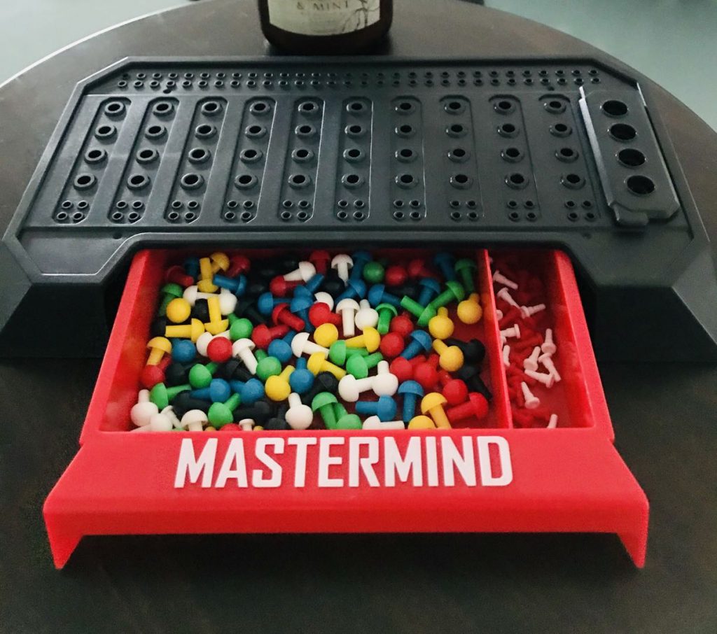 - Mastermind game console with built-in storage tray and code shield