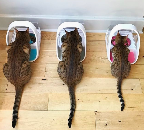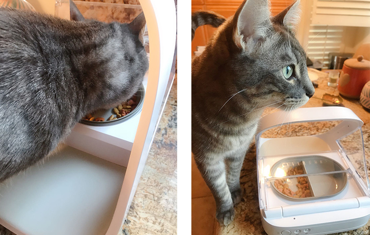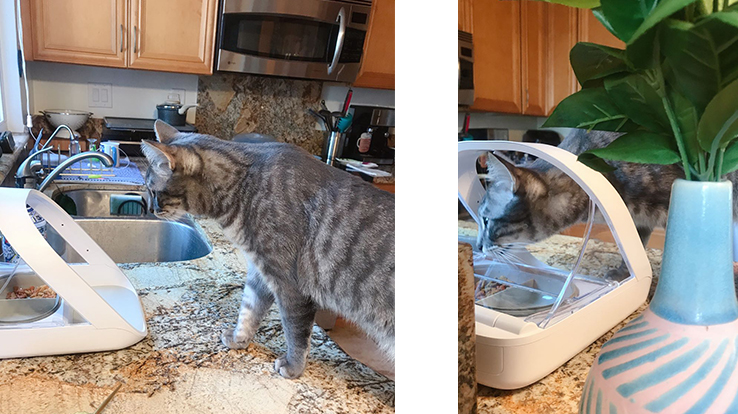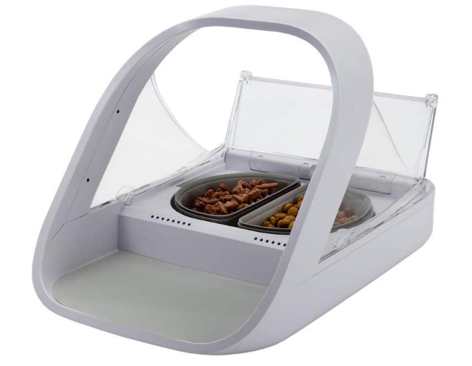 The Microchip Pet Feeder Connect (MSRP $253 w/Hub)The SureFeed® Microchip Pet Feeder Connect uses the same microchip or collar tag to control access to food and goes further by connecting to the Sure Petcare smart phone app via the feeder’s Wi-Fi connection to the optional Hub connected to a home router and the internet. This feeder is the ideal solution for overweight cats, cats with medical conditions that require close monitoring of feeding or multi-pet homes.Using the app owners can access multiple pet feeding profiles and view frequency, duration and times. The app provides a record of normal feeding patterns for each pet and will allow owners to notice changes in behavior that could be an indicator of illness. Use the app to set portion size and the feeders integrated scale uses an LED indicator to measure the exact amount to within one gram of accuracy. The feeder will operate for up to six months on four “C” batteries and includes a three year warranty.