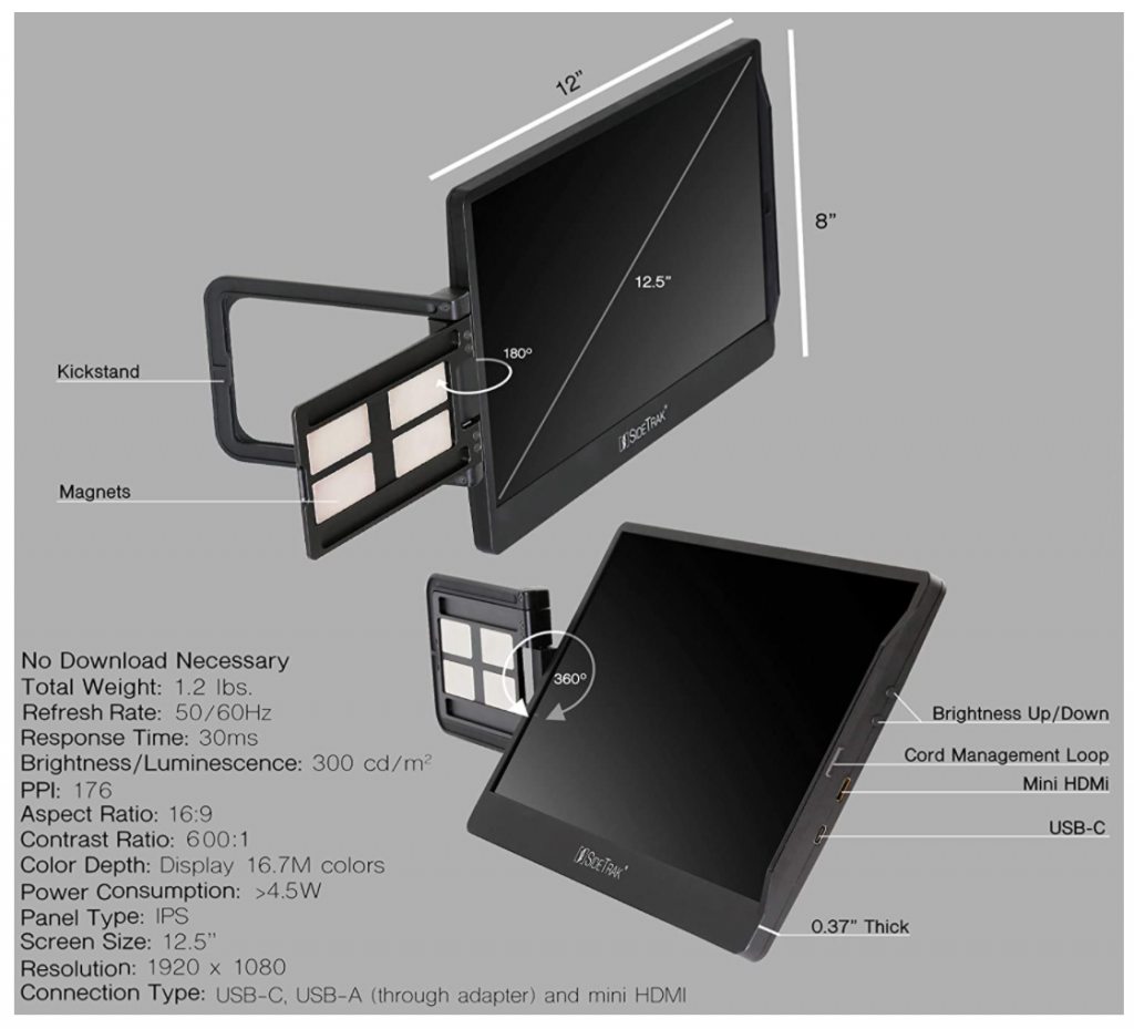 - MAKE YOUR LAPTOP DUAL SCREEN >> SideTrak is a 12.5” FHD IPS portable monitor that securely attaches to the back of your laptop with device-safe metal plates. Perfect for work from home or remote work!