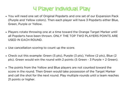 HOW DO YOU SCORE? The closest Popdart to the Target Marker = 3 points. Every other Popdart that sticks = 1 point. Use “Cancellation Scoring” (just like cornhole). For example: 5 blue – 2 green = 3 blue. Each game consists of multiple rounds! First team to reach 21 points wins!