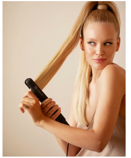 - Styler has an Innovative handle design with a sleek matte black finish + digital screen + rotating swivel cord – power button strategically inside the unit in order avoid turning device off while in use.