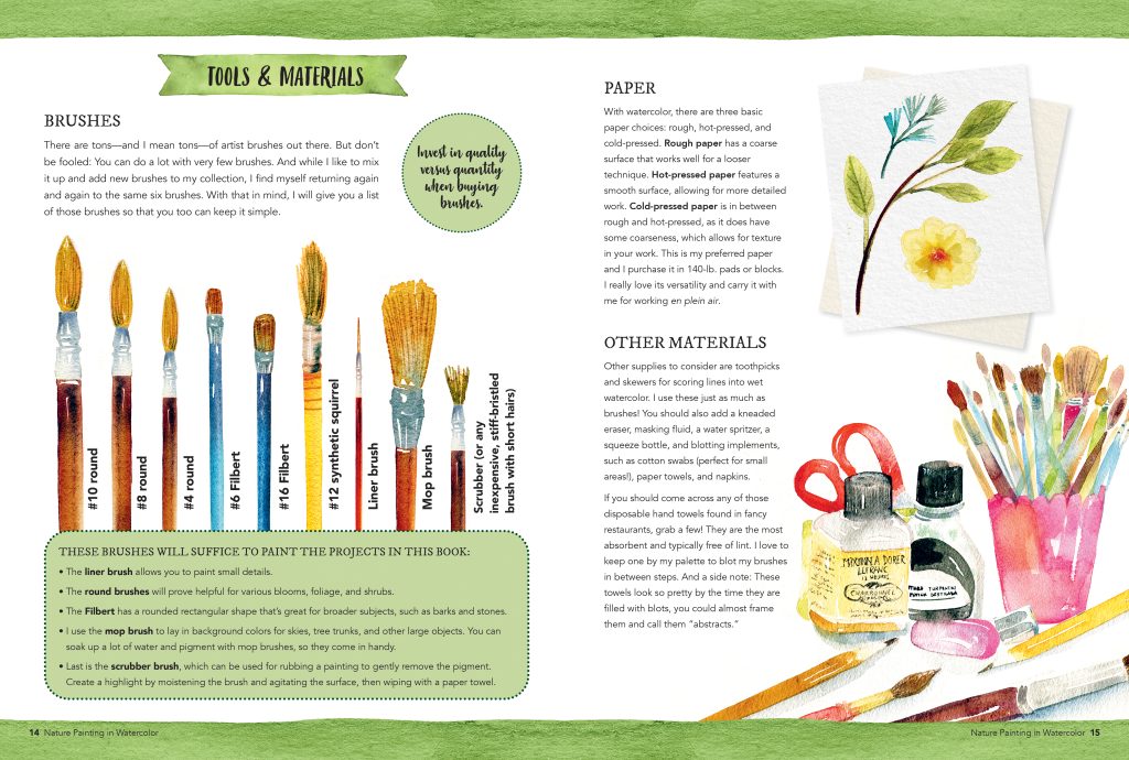 The step-by-step projects cover popular natural painting subjects, including the ones already listed here as well as rocks, mushrooms, buds, blooms, big and small trees, and forest animals. All are illustrated and painted in the author/artists’s signature contemporary watercolor style.