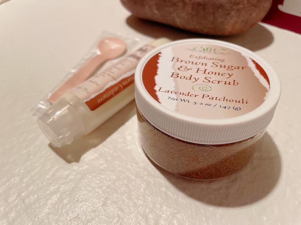 Lavender Patchouli Exfoliating Brown Sugar & Honey Whole Body ScrubLavender, Patchouli Exfoliating Sugar and Honey Whole Body Scrub… Beautifully fragrant Lavender as a top note nurtures and calms while the skin healing cicatrisant therapeutic properties in Patchouli ankers, balances, and allows one’s skin to slowly absorb plant-derived, life giving benefits that only nature offers. Providing more goodness, Calendula oil nourishes skin with antioxidant-rich Vitamin E, brown sugar, orange peel powder and jojoba beads gently exfoliates and slougs away unwanted dead skin, leaving you feeling baby soft.