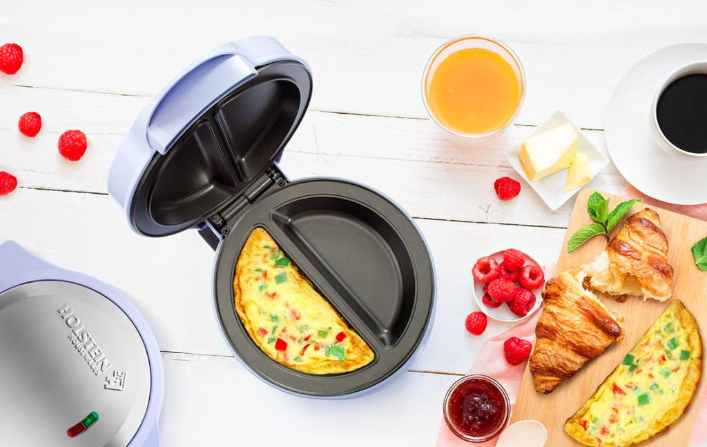 Looking for an appliance that does almost everything for you? Holstein Housewares Omelet Maker cooks fluffy and delicious omelets for a full meal before going to school or work. Its 2-section design will allow you to cook two eggs on each side simultaneously, and its indicator lights will save you time, indicating the ideal time to preheat and cook. A full breakfast is minutes away! Did I mention this is great for leftovers too?