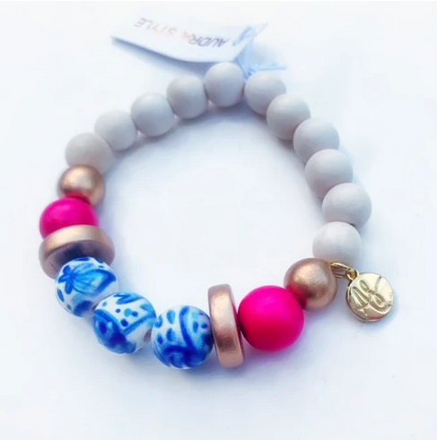 Features wood beads in Audra Style prints with their signature gold brand charm.