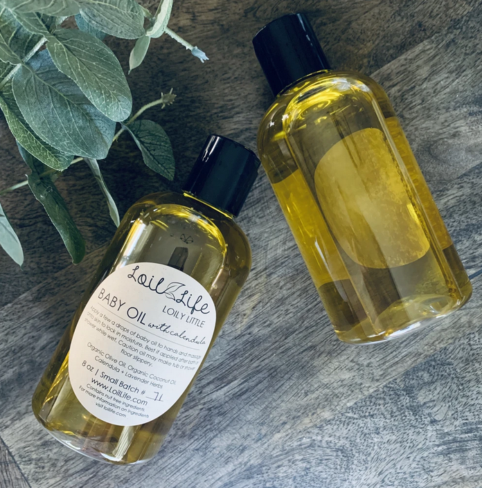 This baby oil is an herbal concoction of skin nurturing ingredients. Formulated with olive oil, coconut oil, calendula and lavender it will soothe and lock in moisture.