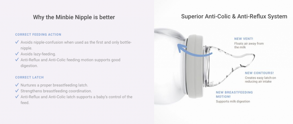 Eating: A lot of moms like myself are planning to breastfeed. But the first lesson of motherhood is that, nothing really goes according to plans! My friend who recently gave birth told me how hard it was and how she wasn’t producing enough milk. So after a few weeks of trying, she switched to formula. With bottle, sometimes there is a lot of air that the baby swallows that can result in gas, burping and discomfort. My sister said only 1 out of 3 of her kids ever took to the bottle and after trying multiple brands and nipples she gave up feeding with bottles. I found out about Minbie Nipples! These new bottle nipple alternative that solves a common problem with feeding. Generic nipples can often result in confusion and the bottle taking-over. Minbie solves this issue by encouraging babies to latch and feed with their instinctive breastfeeding technique.