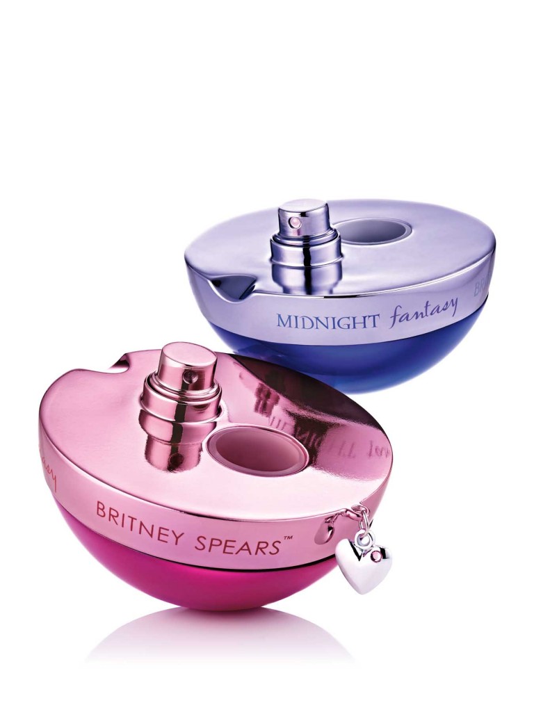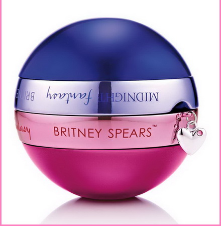 The sleek spherical bottle is 2 separate perfumes in the shape of half circles that lock into each other forming forming the sphere shape. The Midnight Fantasy half is in the color blue & the Fantasy scent half is in the color pink; the star’s favorite colors. It also has a silver heart charm that adds a very girly touch to the appearance.