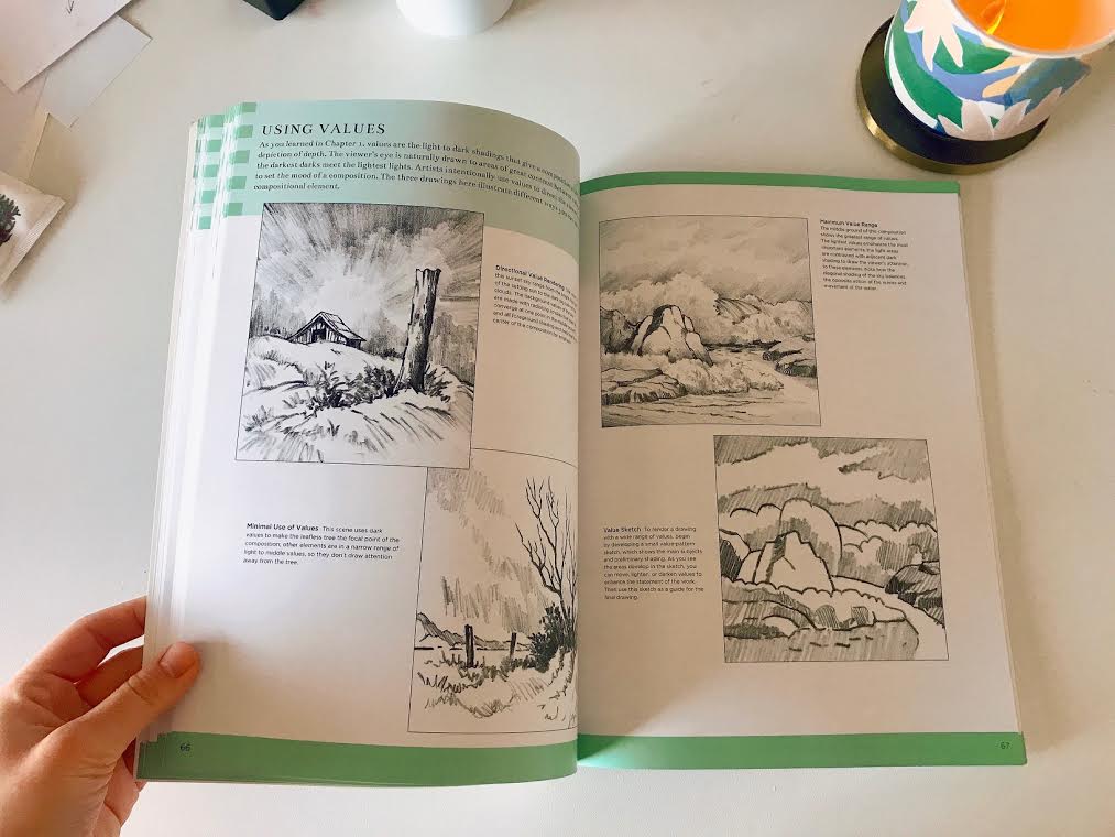 - Values: Covers shapes, form, the light source, how to create depth, and the elements of design.