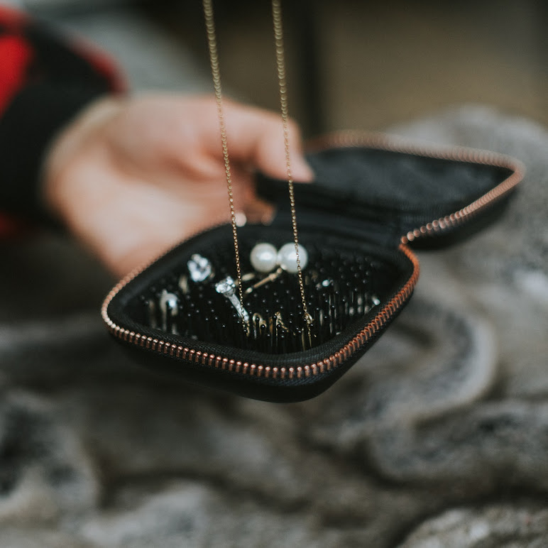 Traditional travel jewelry cases tend to be bulky, time consuming to use, and they fail to solve the problem of necklaces tangling on themselves. So, most of us pop our accessories into plastic bags where there ensues a jewelry wrestling match, resulting in a tangled mess of chains and earring posts.
