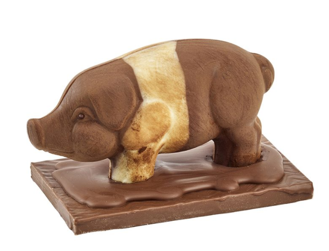 Bring the charms of springtime on farms into your home with this friendly pig that’s certainly having a blast in its chocolate “mud”. Crafted from the finest Swiss milk chocolate, this adorable fellow has hand-made decorations of white chocolate and a cocoa dusted coat, which makes the flavor all the more intensive. Indulge into this creamy delight with your youngsters and bring them closer the world of nature and animals.