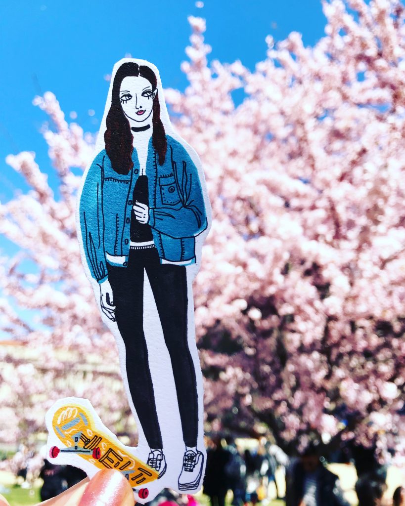 Lulu took her hand craft illustration magnets, it looks like an illustration girl enjoyed the cherry blossoms on her skateboard.