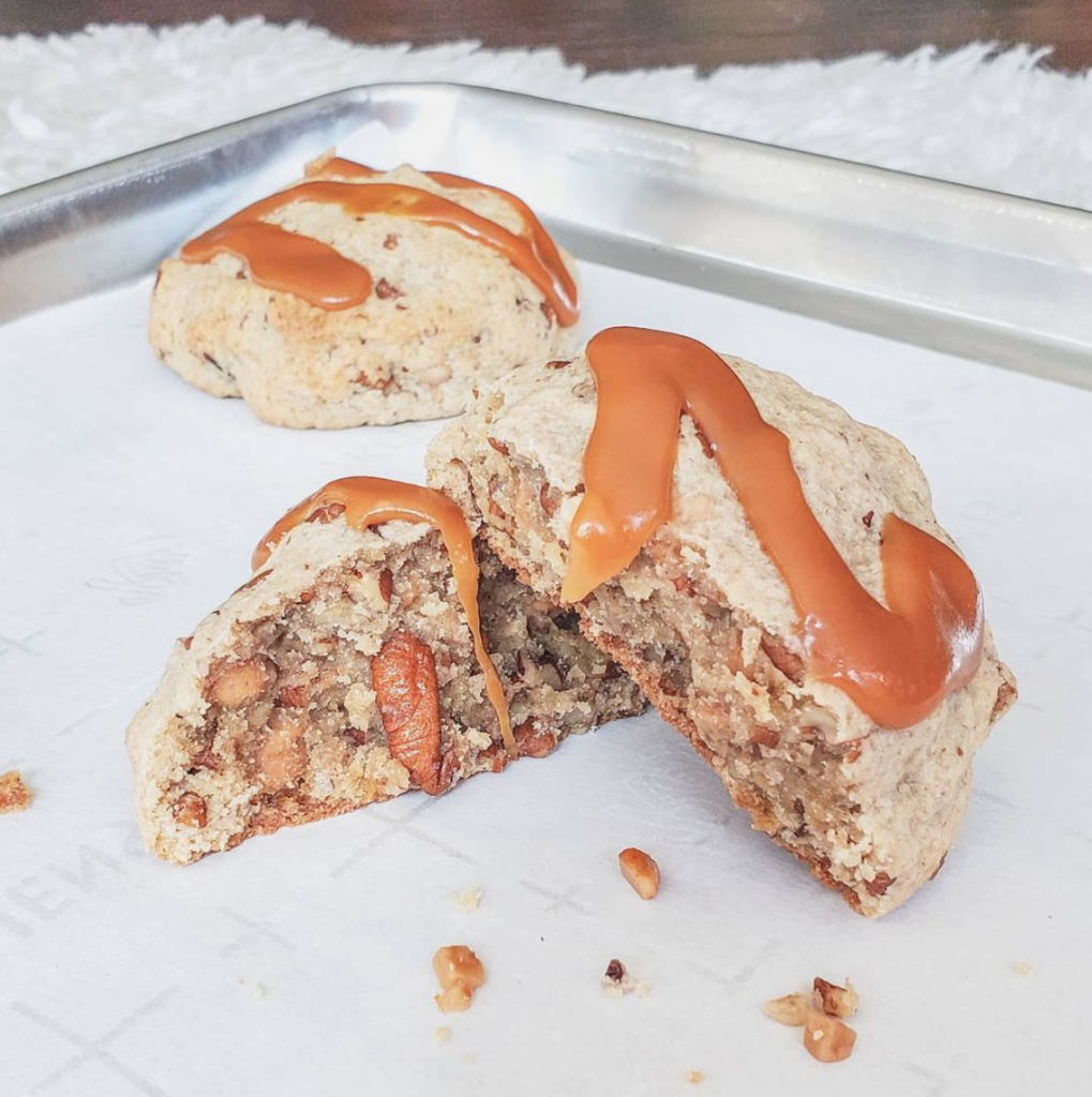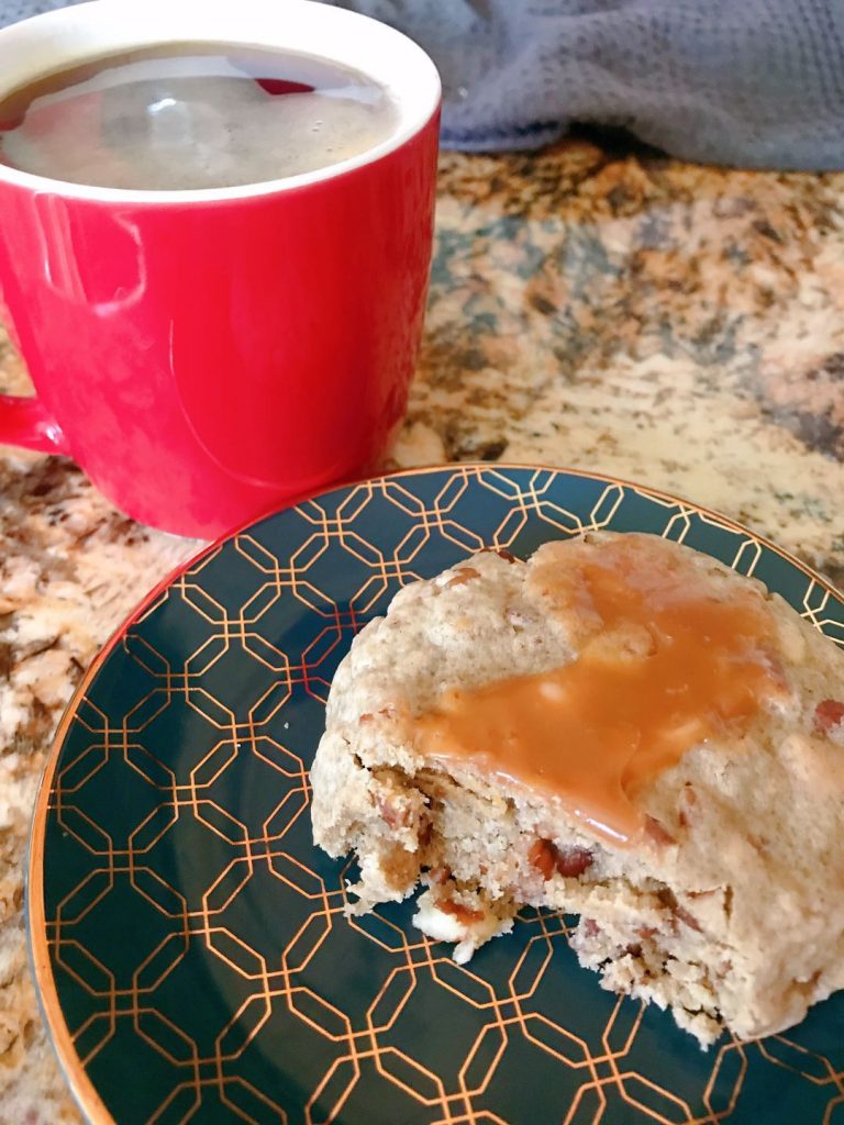 Imagine the sweet scent of caramel filling the air…you walk into the kitchen and see a plate full of salted caramel pecan cookies – loaded with crunchy pecans, salty-sweet caramel bits, and swirled with luscious hand pulled caramel.